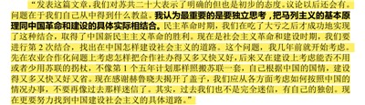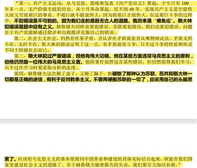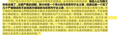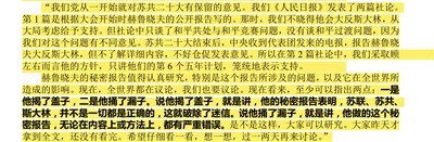 邓小平说:“我们当时在苏联,只是听苏共中央联络部一位联络员让翻译读了一遍,感到内容很乱,逻辑性差,说了一大堆关于斯大林破坏fa制、肃fan中杀错了很多人、对苏德战争毫无准备、在战争中靠地球仪指挥等等,还讲了一个南斯拉夫问题,其它政策性的问题无甚印象。我对苏共中央联络员说:‘此事关系重大,需要向中央报告。’现在再看全文,还没有看完,印象还是不好。现在全世界都议论这个报告,许多兄弟党已表示了态度,恐怕我们党也要表态,采取什么方式可以考虑。”