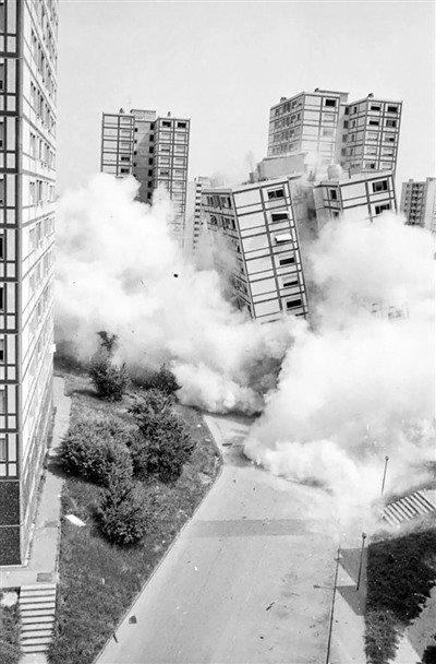 1983年6月9日,Vénissieux当地Les Minguettes社区的住宅楼被拆除的场景 / 来源:Le Progrès newspaper