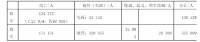 实际上,人民解放军方面的伤亡、被俘或失踪的总计是136 524人——已经是三大决战中的“之最”了,而国民党军方面,伤亡总数为171 151人;被俘是320 355人,起义和投诚的总数为63 593人。这也就是说,国民党军伤亡以外的人数,才是“30余万”——占了国民党军人员损失数的大头。