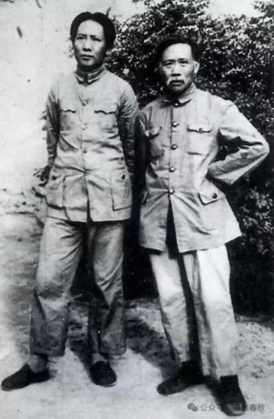 ▲1936年,毛泽东和他青年时期的老师徐特立在保安