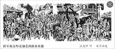 ▲红军抵达哈达铺受到群众欢迎(沈尧伊 作)