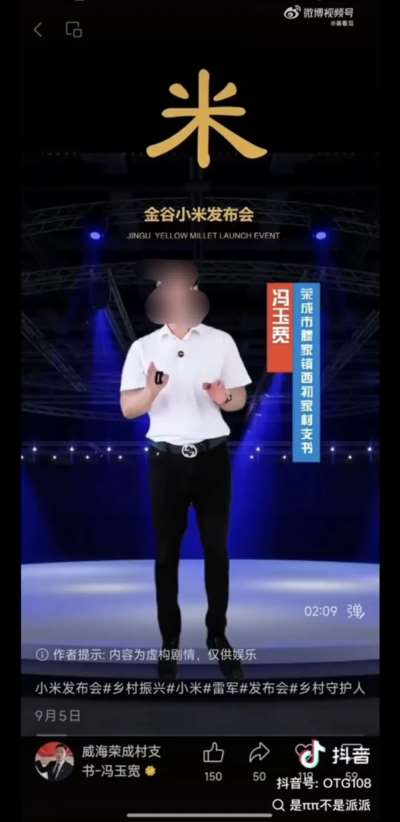 近日,山东威海市荣成村支书冯玉宽,因发布视频“用雷军的方式带货当地特产小米”而被小米汽车投诉下架。