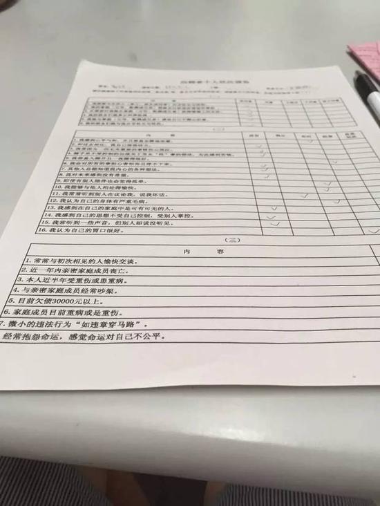 但这种“高效”颇有些“形同虚设”的意味。笔试前,会有人专门嘱咐“待会儿什么好就填什么”,发放的卷子上,罗列了“我对未来感觉到没有希望”、“即使有别人陪伴我也会觉得孤单”等心理测试题目,而按照此前的嘱咐,自然选择的都是“从没有”。