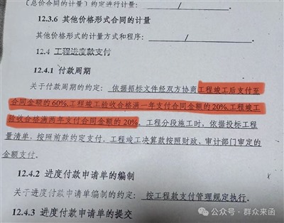 合同中,“关于付款周期的约定”显示:依据招标文件经双方协商工程竣工后支付至合同金额的60%,工程竣工验收合格满一年支付合同金额的20%,工程竣工验收合格满两年支付合同金额的20%。也就是说,全部工程款都应在工程竣工验收合格满两年支付完毕。