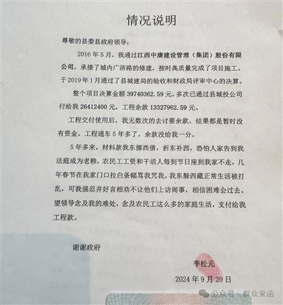 在李松元于2024年9月20日写给武陟县委县政府领导的“情况说明”中,他说,“5年多来,材料款我东挪西借,拆东补西,恐怕人家告我到法庭成为老赖,农民工工资和干活人每到节日坐我家不走,几年春节在我家门口拉白条幅骂我咒我,我东躲西藏正常生活被打乱,可我强忍并好言相劝不让他们上访闹事,相信困难会过去。望领导念及我的难处,念及农民工这么多的家庭生活,支付给我工程款。”