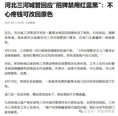 据《九派新闻》4月11日报道:近日,河北省三河燕郊开发区一蜜雪冰城店的招牌改成了绿色,引发热议。据媒体报道,网友称河北省廊坊市三河市城管部门要求,红底门头牌匾统一更换颜色。
