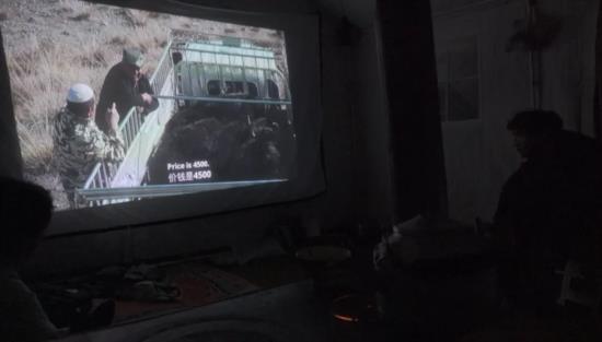 ◉给收羊人们放映去年拍摄的纪录片。图片:谢小丹