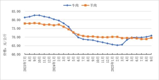 全国市场的数据也差不多:整个9月,全国牛肉平均价格70.90元/公斤,羊肉69.59元/公斤。但是,对比2023年,牛羊肉依然每公斤跌了10元左右。