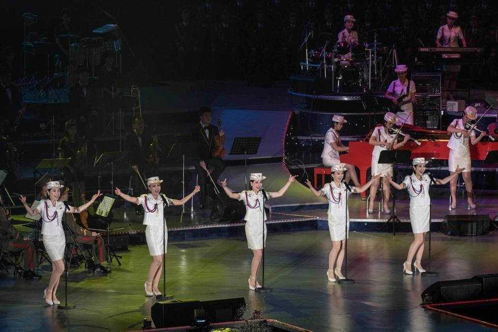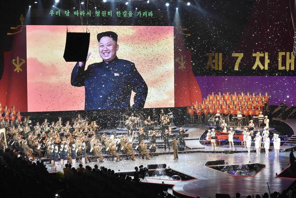 当地时间2016年5月11日,朝鲜平壤举办音乐会,庆祝劳动党七大闭幕,牡丹峰乐团登台表演。