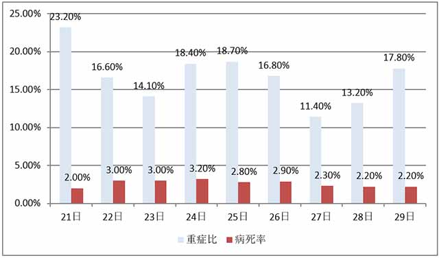 非典病死率很高,中国大概在7%左右,北京接近8%,广东应该有5%。但香港17%,台湾29%。而且非典几乎全是重病号,只要确诊就进ICU上呼吸机。现在看来,武汉肺炎没那么厉害。下面是全国20日至今的重病比和病死率(病死人数/全国累计确诊病例)