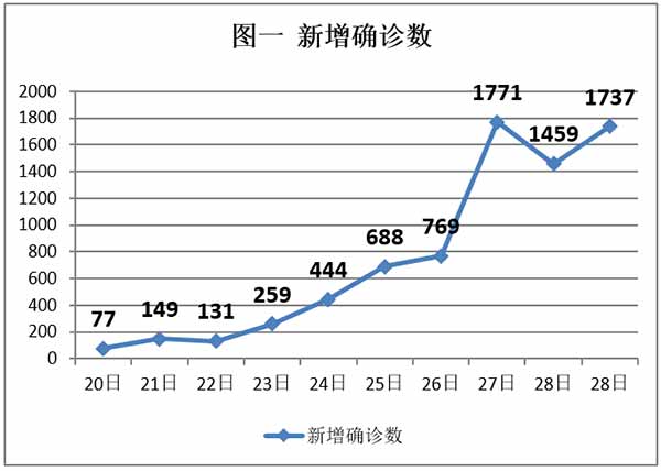 贫道从24日起,查看每天早晨8点多国家卫健委公告的数据,然后在朋友圈里把20日到当天的“新增确诊病例”做一个图示,分析疫情-防疫的走势。