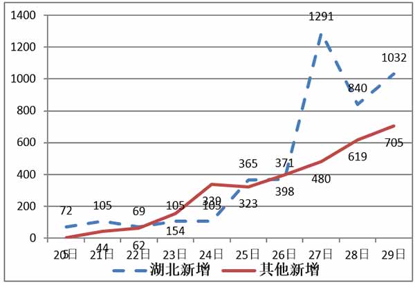 其实,把湖北新增确诊病例曲线与非湖北省区的曲线对比,如果扣除27日干扰因素也是很接近的,只是湖北情况更差些而已。见下图: