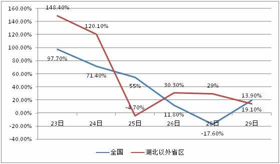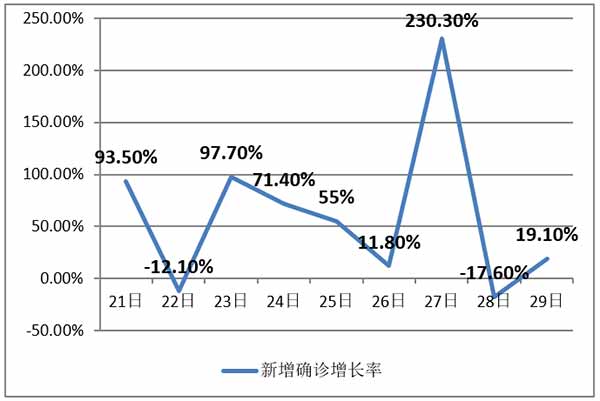 新增确诊虽然在上升,但即使扣除27日的非正常波动,上升势头是在减缓。确诊数增加意味着确诊数增长率是正数,降低增长率就是负数。这些日子经常听“增幅放缓”这个词,什么“猪肉价格增幅放缓”(也有“收窄”一说),有点忽悠人的嫌疑。但这个词是有意义的,是说增长率在降低。比如昨天比前天增长25%,今天比昨天只增长了10%,虽然还在增长,但增速在“放缓”。图二是21日到29日新增确诊病例的环比(比前一天)增长率。