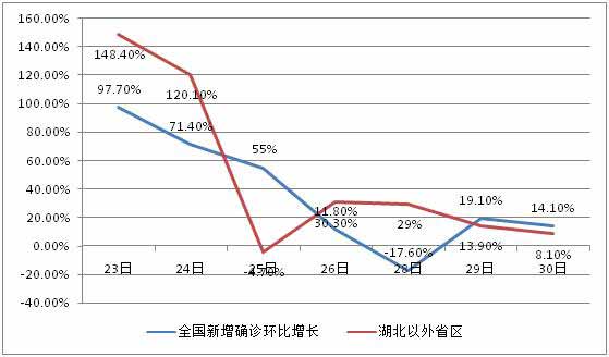 把27日武汉检疫条件改善形成的数量突变排除掉,取29-30日这2天数据,湖北省新增病例增长率分别是22.9%和18.2%,呈下降趋势。但其他省区是13.9%和8.1%。也就是说从疫情控制情况看,湖北比其他省区慢两天左右。见下图: