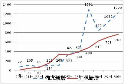 元月26日,湖北新增病例398例,其他省市371例,湖北每日新增病例仅比其他地区高出7.3%。但30日湖北新增1220,其他省区新增722例。湖北新增高出其他省区70%。