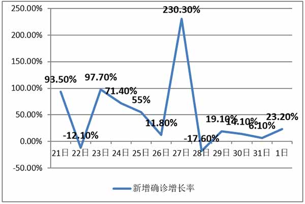 新增确诊病例环比增长率出现反复,昨天又开始抬升,说明疫情出现新的恶化因素,将使“零点”出现推迟,高峰更高。见下图: