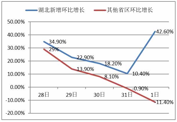 从公告数字看,湖北省在28日前数据波动幅度很大,这里有统计问题,也有检疫能力方面问题。但28后新增确诊环比增长数一直呈下降趋势,从35%逐日下降到31日的10.4%,但昨天突然猛增到42.6%,使本来已经耷拉的新增病例曲线又翘起头来。究竟发生了什么贫道不清楚,如果不是统计问题,说湖北防疫形势没有好转,或者说疫情尚未得到有效控制是没错的。由于得不到武汉疫情数据,不能做更细的分析。