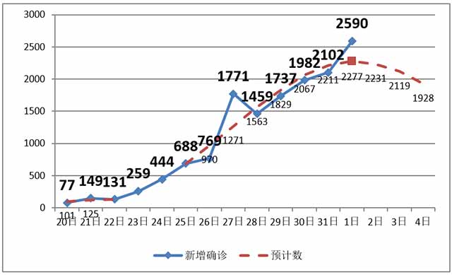 一个坏消息:湖北新冠数据昨天很不好,导致全国数据都很差,开始偏离贫道昨天说的这几天就会出现拐点的预期。全国新增确诊2590例,比前天的2102例多出578例,也比贫道此前预期的最高点2277人多出313人。见下图: