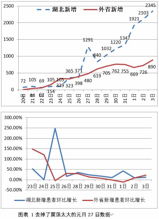 根据湖北媒体说,春节前在湖北的外省大学生和打工者离开湖北的高峰期元月15-18日,大部分在20日前离开,23日(腊月29)封城时抢跑的占总计500万人的比例很低。按照新冠潜伏期和发病高峰期,最长14天,大部分是在感染后5-10天时发病的。外省新增患者在初期肯定基本是近期有湖北停留经历的输入型。如果这个发病规律是准确的,那么外省第一批患者出现的高峰应该在元月23-28日,新增患者增长率应该偏高。此后应该有连续几日的增幅收窄期。如果不发生较明显的二次传染(即从输入性传染到社区传染),在最后一批成规模的湖北经历者离开武汉14天后,大约在2月1-3日,新增病例环比增长会大幅下降。