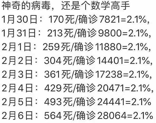 这组数据如同那个智力测验题一样,都是在暗指湖北尤其武汉的患者数据在造假,实际感染数要大于公布数。不过这组数的漏洞是致命的——并不是公布数据而是他自己编造的数据,只是他知道没人会查查公布数据而已。公布病死率数据贫道每天都介绍了,30日-6日中只有1、2、3三天病死率是2.1%,其余的要么大要么小,称不上“数学高手”。