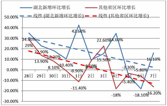 武汉外省区新增病例在元月31日和2月1日连续两天下降,贫道觉得出现了拐点。但接着两天大幅攀升,2月3日比前面的高点高出17%,这样前面的转折就不叫拐点。经过两天反复后,外省数据连续4天下降了到高点的三分之二位置,起码可以判断外省防疫已经有效控制了疫情发展,不出大的事故,不会再发生逆转了。