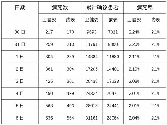 其实,这张表编造的漏洞百出,贫道惊奇的是转载的人为什么看不出来。就算不会查数据,除法总会把。把原表中每行的死亡数除以患者总数,得数有2.1%的吗?没有几个,起码前三个分别是2.17%、2.17%和2.18%。去小数点后一位都是2.2%。除了你的算术老师教错了或者是编瞎话的人算术老师是学体育的。