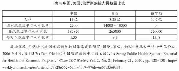 如果进行国际比较的话,中国疾控人员的短缺就更显得触目惊心了。中国人口是美国的四倍多,是俄罗斯的近十倍,但美国与俄罗斯的疾控人员都比中国多。换算为每万人疾控人员占比,美国是9.3,俄罗斯更高达13.8,都远远高于中国的1.35(见表4)。中国的国家疾控中心有2200多名工作人员,在很多国人看来,仿佛是个庞然大物。殊不知,美国的联邦疾控中心(CDC)除了1.4万名正式雇员外,还有约1万名合同制工作人员,两者相加足足是中国的10倍!