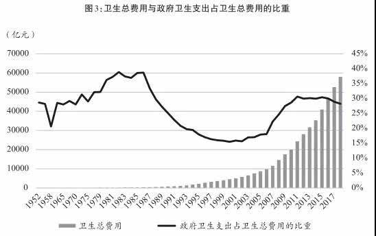这次危机产生的根本原因是,在推动经济改革与发展的过程中,政府当时误以为经济增长是唯一的“硬道理”,只要经济持续增长,饼越做越大,其他一切问题都会迎刃而解,从而忽略了卫生事业。其最初的苗头是,政府卫生支出占卫生总费用的比重急剧、大幅下滑。从新中国成立之初开始,到20世纪80年代中期,政府卫生支出占卫生总费用的比重一直呈上升趋势。1986年,这个比重达38.6%,处于历史最高位。但此后它就开始快速下滑:两年后跌破30%;1993年跌破20%;2000年降至15.5%,是新中国历史上的最低位(见图3)。