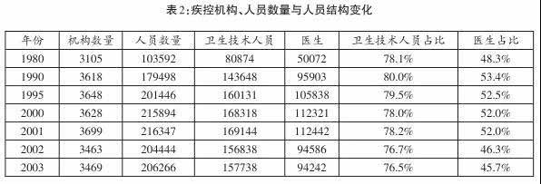 在整个第三次危机的发展过程中,防疫(或疾控)机构的数量从3400余个上升到了3800余个(见图2),人员数量也略有增加。这次危机显然与前两次危机的表现形式并不相同,但实质却大同小异,因为不务正业也是一种名存实亡。进一步分析防疫(或疾控)人员的构成,还可发现危机的另一表征:虽然人员总数没有减少,但其中卫生技术人员的占比下降了,尤其是医师或助理医师的占比下降更快,从1990年的53.4%跌到2003年的45.7%(见表2)。究其原因,很简单,即使卫生防疫站可以行医,患者还是更愿意去正规医院看病;如此一来,在医院当大夫比在防疫站当大夫的收入往往高得多,导致防疫站具有医师资格的人员不断外流。
