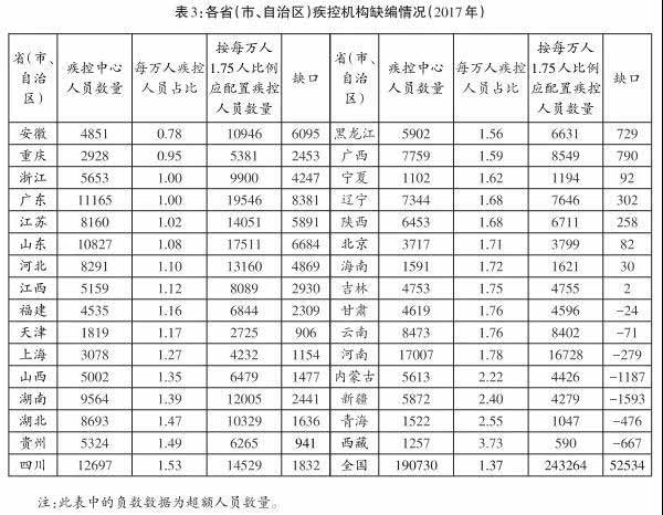 如果以省为单位来检视,全国所有省、自治区、直辖市的疾控机构都缺编。如按每万人1.75人配置,几个少数民族聚居的省、自治区看似超编,其实不然,因为它们的人口密度几乎都小于25人/平方公里;如按每万人3人配置,它们的疾控人员也远远不够(见表3)。
