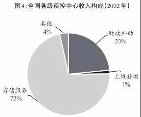 2002年,卫生部推动“两项体制改革”,将各级卫生防疫站原有的卫生执法、监督职能剥离,只保留其疾病预防控制、公共卫生技术管理和服务等职能,整体更名为各级“疾病预防控制中心”(以下简称“疾控中心”)。与改制前的卫生防疫站不同,改制后的疾控中心是单纯的事业单位,而不再是具有行政执法权的政府部门。这一年,全国各级疾控中心的收入中,财政补助与上级补助加在一起,占比不过只有区区24%,而有偿服务占比却高达72%(见图4)。只有不务疾病预防控制这个“正业”,才可能出现这样不正常的局面。