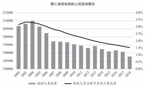 政府与社会对疾控事业的忽略,必然产生削弱疾控机构的后果。陈竺在2007年说,“人才队伍建设是疾控能力建设的基础”,但恰恰是这个基础遭到了严重的侵蚀。2003年以来,中国的疾控人员数量不但没有增加,反倒减少了一成。中国的疾控人员本来就不多,2003年只有20.8万人;减少10%,到2018年才剩下18.8万人。这发生在中国整体医疗卫生工数量翻了一番的大背景下,足以显示疾控机构人员流失的严重程度(见图8)!