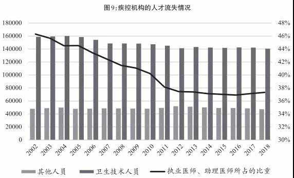 更为严重的是,从疾控机构外流的主要是卫生技术人才,而不是其他普通工作人员。在2002年—2018年间,全国疾控中心的普通工作人员数目略降1.4%,而卫生技术人员下降11.5%,其中执业医师与助理医师大降近27%,导致在全部疾控人员中,执业医师与助理医师所占的比重从46.4%跌至37.3%(见图9)。