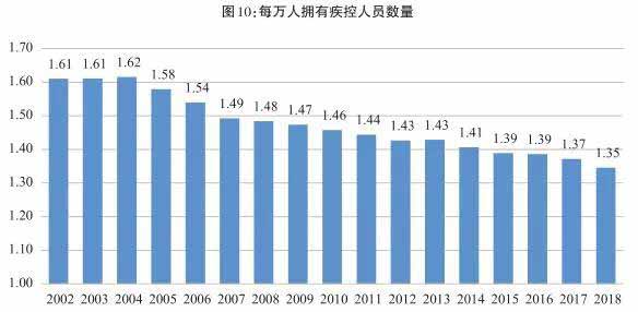 哪怕不计质量,仅就人员数量而言,中国的疾控机构也是严重缺员。为有效落实疾病预防控制职能,2014年,中央编办、财政部和国家卫生计生委联合印发了《关于疾病预防控制中心机构编制标准的指导意见》。它规定,疾控中心的人员编制以省、自治区、直辖市为单位,按其常住人口每万人1.75人的比例核定;地域面积在50万平方公里以上且人口密度小于25人/平方公里的省、自治区,则按不高于本地区常住人口每万人3人的比例核定。如果用这个指标衡量,从2002年到2018年,中国疾控机构的人员数量从来没有满足过编制要求(见图10),与其他政府部门、事业单位不断突破编制上限形成强烈反差。2018年,中国有13.95亿人口,如果按每万人1.75人配置,全国需要有24.4万名疾控人员,而当年中国每万人只有1.35名疾控人员,缺编5.64万人。