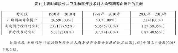 随着健康水平提高,生活质量改善,到1980年,我国人均预期寿命已提高到69岁。美国在整个20世纪,人均预期寿命提高了30岁,而新中国仅在成立后的头30年就提高了34岁,平均每年提高1.1岁,是人均预期寿命的快速提高期(见图1)。一项跨院校、跨学科的研究表明,在1950年—2010年间,疾病预防控制对人均预期寿命提高的贡献率高达80%,其余20%才是诊疗医术的贡献(见表1)。如果对1950年—1980年的情况加以测算,疾病预防控制对人均预期寿命提高的贡献率应该更高。很显然,不执行“预防为主”的卫生工作方针,没有两个卫生防疫网络,是无论如何都不可能取得如此辉煌成就的。