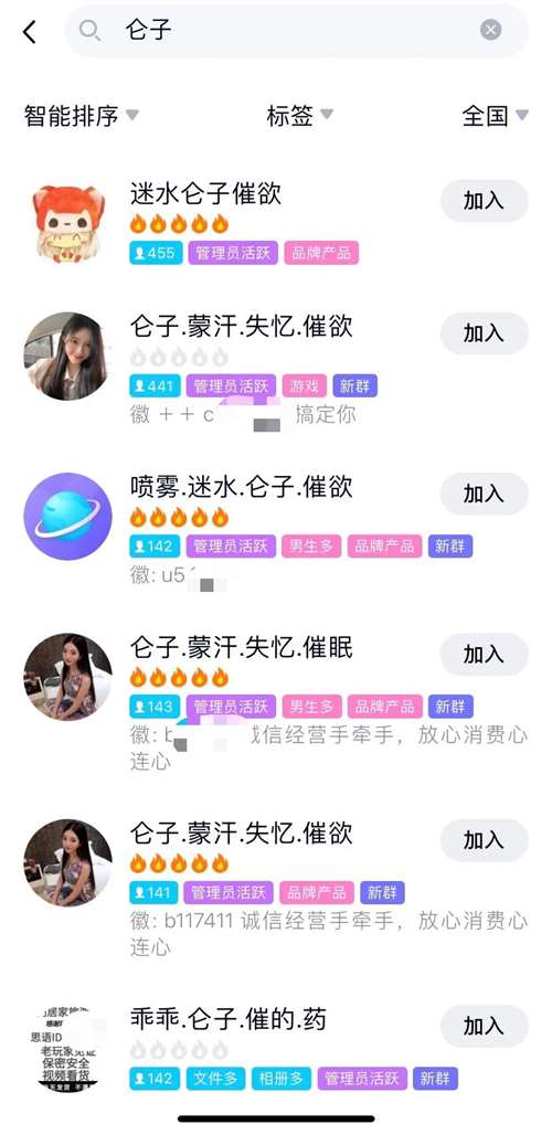 在QQ上,出现上百个涉嫌销售三唑仑及三唑仑和其他精神活性物质兑成的“听话水、乖乖水、失忆水”社群。