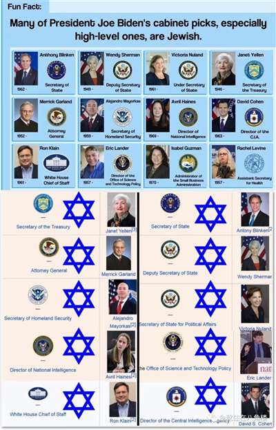 拜登的白宫幕僚长罗纳德·克莱恩 (Ronald Klain)、国务卿安东尼·布林肯 (Anthony Blinken)、财政部长珍妮特·耶伦(Janet Yellen)、司法部长梅里克·加兰德(Merrick Garland) 、国土安全部长亚历杭德罗·马约尔卡斯(Alejandro Mayorkas)、国家情报总监埃夫丽尔·海恩斯(Avril Haines)、副国务卿温迪·舍曼(Wendy Sherman)、美国科学与科技顾问埃里克·兰德(Eric Lander)、国家网络安全顾问 安妮·纽博格(Ann Neuberger)、中央情报局副局长大卫·科恩(David Cohen)、小企业管理局(唯一的内阁级别联邦机构)局长伊莎贝尔·古兹曼——全部都是犹太人。