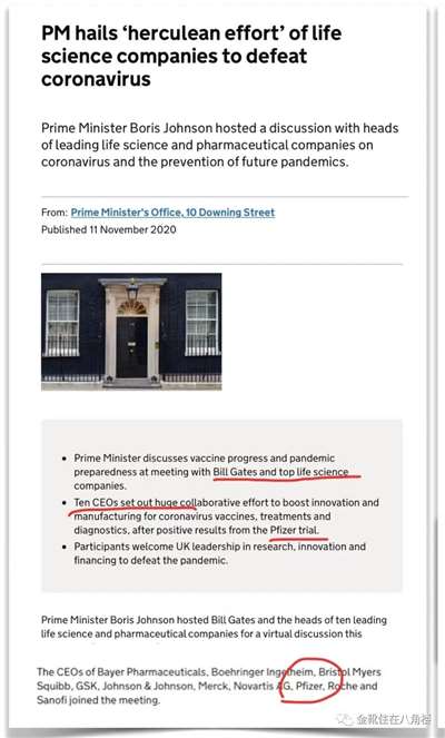 2015年时,盖茨就预言过“会有全球的呼吸系统传染疾病发生”,此后他又联同众多医药财阀与英国首相约翰逊会面,商议如何大面积铺开疫苗的接种(当时辉瑞CEO、前文提到的犹太人布拉也在场)。