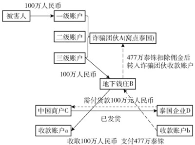 由于线上洗钱活动超出了地缘空间限制,妙瓦底窝点完全可以委托缅北“水房”和地下钱庄代为洗钱,也可以利用当地的“对冲型”地下钱庄进行跨境汇兑洗钱。例如,妙瓦底的外汇黑市或“换钱点”将诈骗团伙获取的100万人民币(约合477万泰铢)赃款直接转移给与泰国企业进行商贸往来的中国企业或商户的银行账户,然后收取泰国企业的477万泰铢交易款,扣除佣金后将剩余洗白资金转移给诈骗团伙(见图2)。