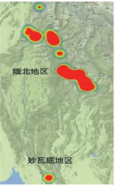位于缅泰边境以非法走私而闻名的贸易口岸妙瓦底,具有与缅北地区类似的复杂的民族联邦政治背景与自治性质,且有为数不少的华人,尤其是台湾人在此聚居。最开始是一些从柬埔寨西港撤离的“杀猪盘”诈骗团伙选择在此搭建新的窝点,随着时间的推移则可能逐成“气候”,成为缅北窝点发生犯罪迁移的重点目的地。对2020~2021年已经破获的电信网络诈骗案件位于缅甸的部分诈骗窝点进行GIS地理信息统计和热力图分析,122个窝点主要分布在缅北的果敢、佤邦、勐腊等地,少数分布在缅南的妙瓦底,形成了南北两大诈骗窝点集中的热点区域(见图1)。继续打击盘踞在缅北地区的话务窝点、密切关注妙瓦底的电信网络诈骗犯罪城市发展趋势,合理部署警力,找准应对方略,是未来有效遏制电信网络诈骗高发势头的关键。