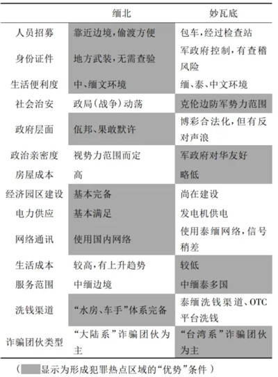 表 1 缅北与妙瓦底电信网络诈骗犯罪条件对比