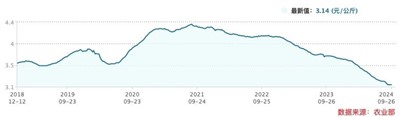 国内原奶周期可划分为2008-2013年年底、2014-2021年年中、2021-至今三轮,本轮原奶周期从2021年高点4.38元下跌至2024年9月底3.14元/公斤,跌幅已超过28% | 图片来源:财联社