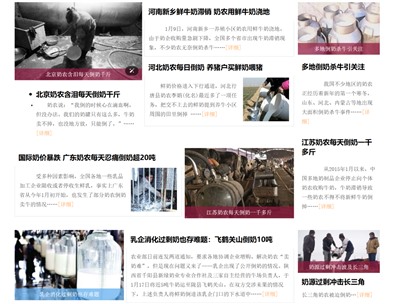 2015年伊始,生鲜乳收购价格迅速下跌,与此同时奶农的养殖成本却在不断上涨。据报道在鲜牛奶价格最低的时候,一公斤奶还不到一块钱,甚至还没超市里的矿泉水贵。乳企收购量的减少加之原奶收购价格下跌,1月份在北京、山东、河北、内蒙古等地出现了奶农“倒奶杀牛”事件。图为中国新闻网的2015年1月的专题报道 | 图片来源:中国新闻网