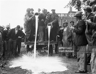 20世纪30年代的大萧条重创美国农业,具体到奶牛养殖,牛奶收购价已经低到无法维持奶农基本生活的水平。图为1933年9月16日,芝加哥地区罢工的奶农们封锁公路,强行倾倒非罢工奶农的牛奶,理由是“防止其他奶农以低价出售牛奶” | 图片来源:gettyimages