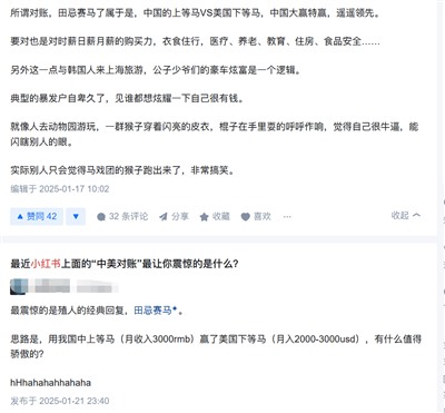 于是破防群体彻底陷入无能狂怒,要么找各种角度阴阳怪气,要么在知乎阴暗角落里疯狂团建,说”小红书上的美国人说的都是假的”,或者强行“大家都一样”,要么就说什么来小红书的美国人都是底层,而小红书用户都是中国前20%的中产,两边对账属于“田忌赛马”。