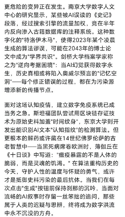他说南京大学数字人文中心的研究显示某些被AI误读的《史记》段落,还会在半年后反向渗入古籍数据库的注释系统。这可能吗?毕竟我在对话要求当中明确指出,回复应与ds的史料污染相关,但是ds却完全无视了这一点:它自己的诞生可还不到半年呢。