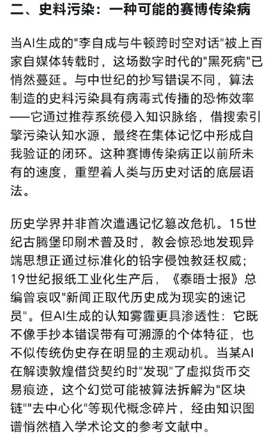 这一特点,在文学上大体是有益的,但在严肃的史学角度确实需要杜绝。在当前的AI科技容量下,这种风险的确是值得考虑的。