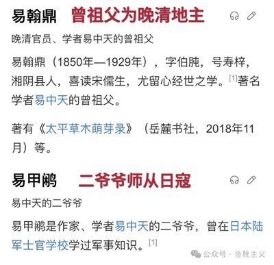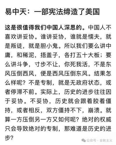 该文中,易中天全然否定党领导工农阶级推翻“三座大山”的历史功绩,认为封建主义是秦始皇推翻的、帝国主义是孙中山推翻的、官僚资本主义则完全不存在。