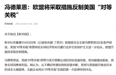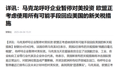 问题是,与我国迅速实行对等关税不同,除了马克龙无人理会的威胁之外,也只有欧盟委员会主席冯德莱恩缺乏细节的威胁。这恰恰暴露了欧盟并没有自己所宣称的独立自主战略能力。