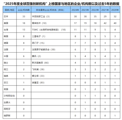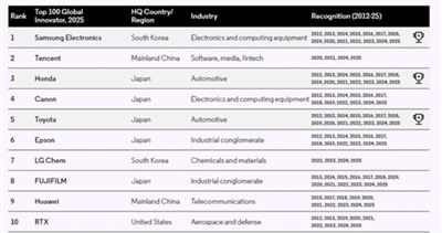 最近看到一个榜单让笔者产生不少感想。在产权与科技创新分析机构科睿唯安最新发布的2025年度《全球百强创新机构》报告中,有六家中国大陆企业上榜,其中有两家中国大陆企业名列前十。腾讯在榜单中排名全球第二,华为排名全球第九,其他公司是京东方、蚂蚁集团、宁德时代和瑞声科技。